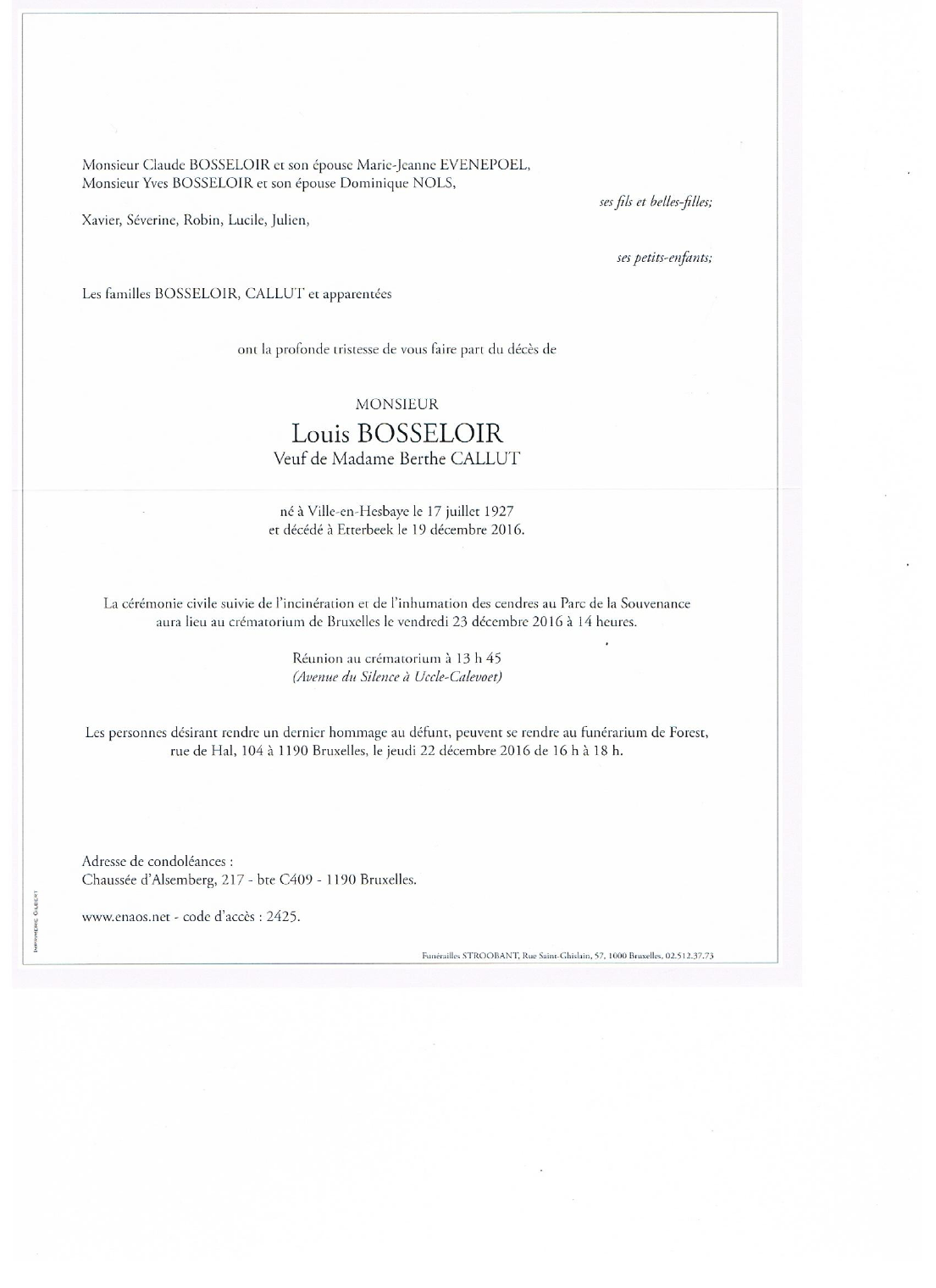 Décédé à Bruxelles (Etterbeek) (1040) le lundi 19 décembre 2016 à l'âge de 89 ans