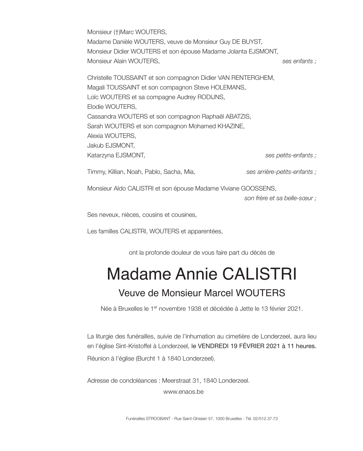 Décédée à Bruxelles (Jette) (1090) le samedi 13 février 2021 à l'âge de 82 ans