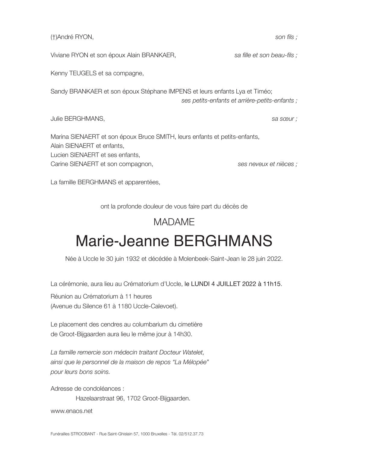 Décédée à Molenbeek-Saint-Jean (1080) le mardi 28 juin 2022 à l'âge de 89 ans