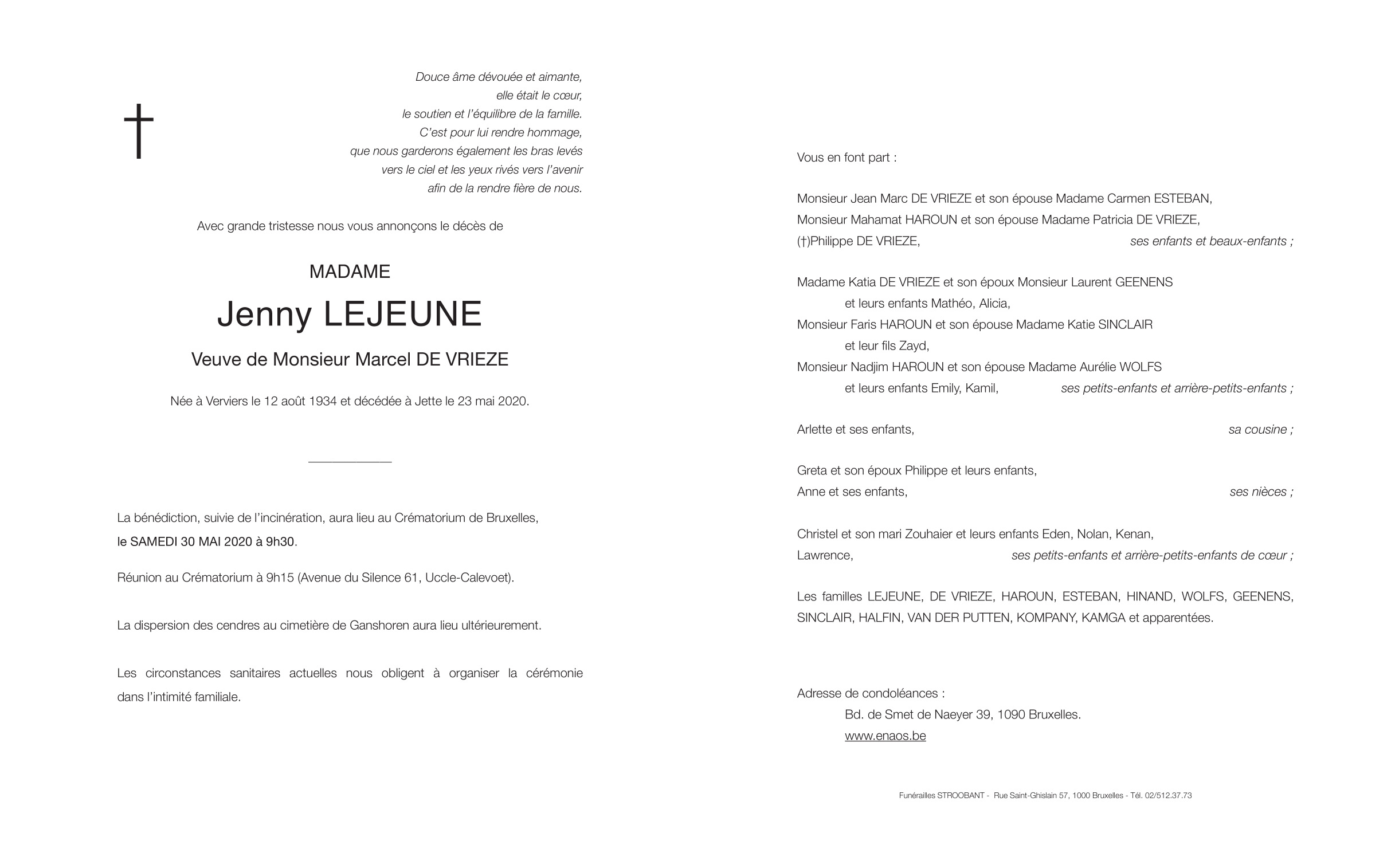 Décédée à Bruxelles (Jette) (1090) le samedi 23 mai 2020 à l'âge de 85 ans